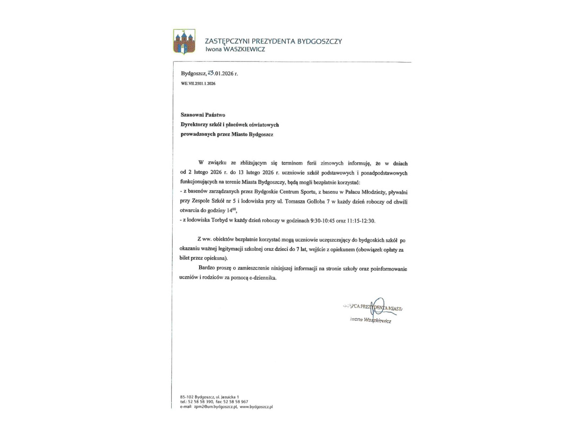 Komunikat dotyczący ferii zimowych w naszym mieście
