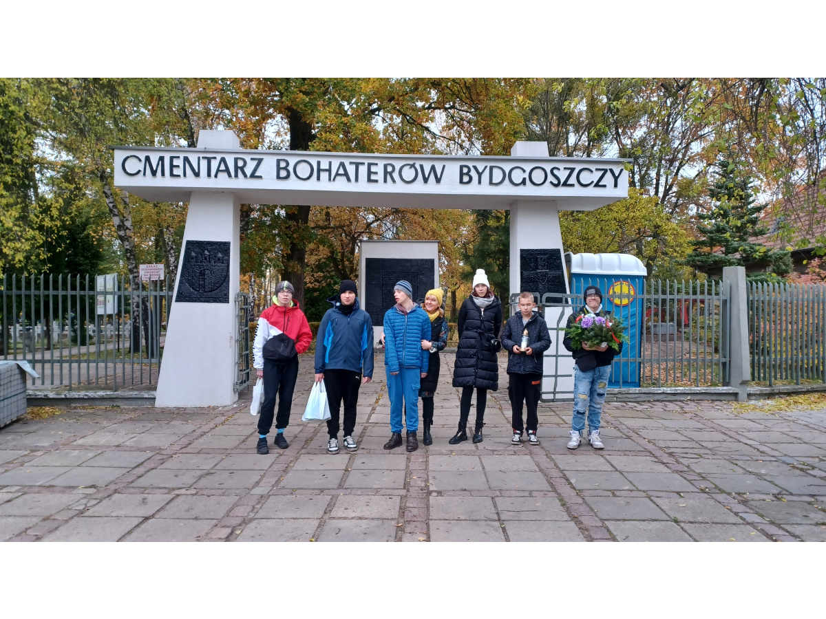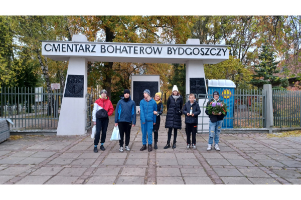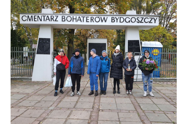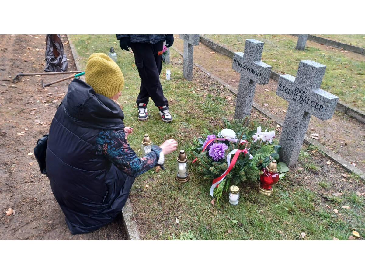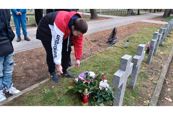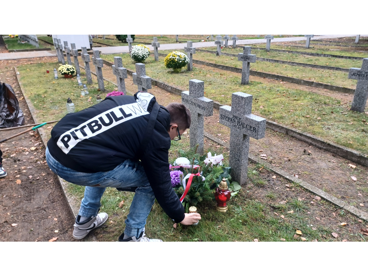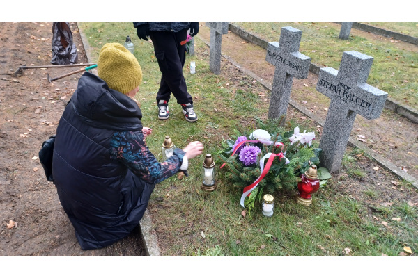 Uczniowie odwiedzili Cmentarz Bohaterów Bydgoszczy, złożyli własnoręcznie wykonany wieniec i zapalili znicze na grobie Stefana Balcera.