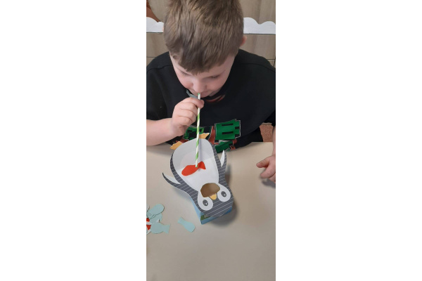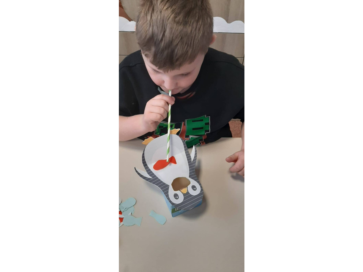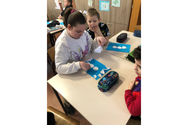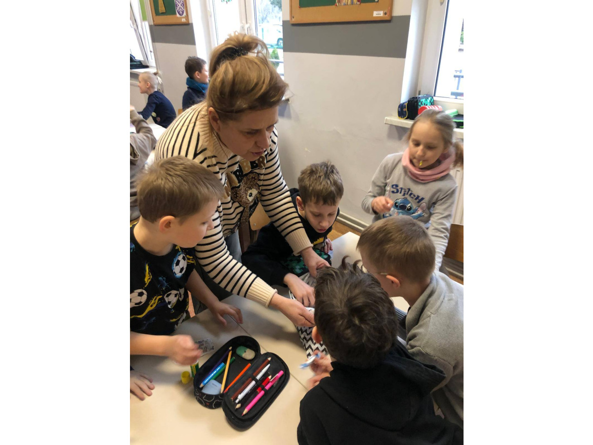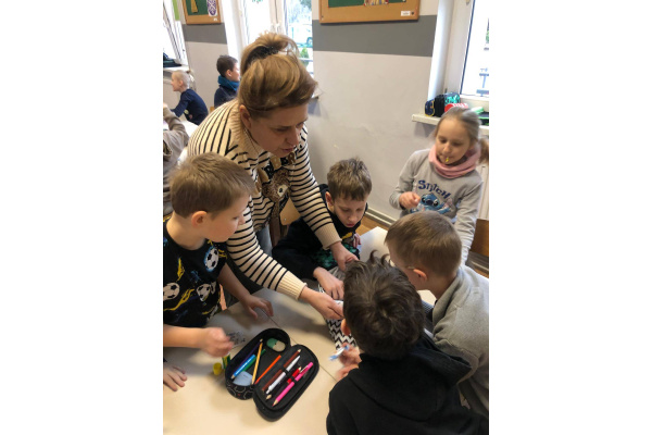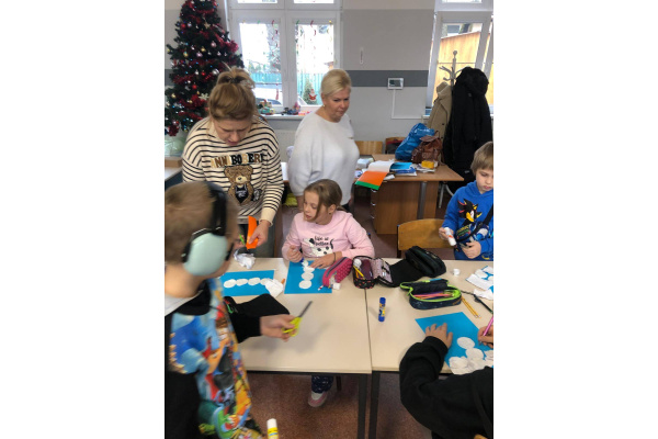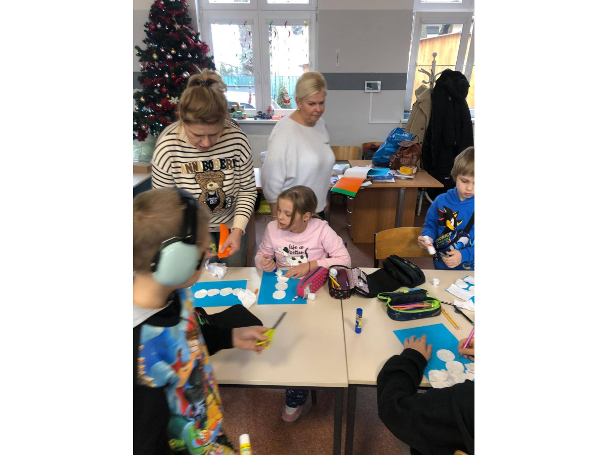 Dzieci zdobywały wiedzę o aktualnej porze roku. Inspirowane muzyką, tworzyły śnieżne ekspresje, które następnie przelewały na kartki papieru. Było śnieżnie, biało i zimowo.